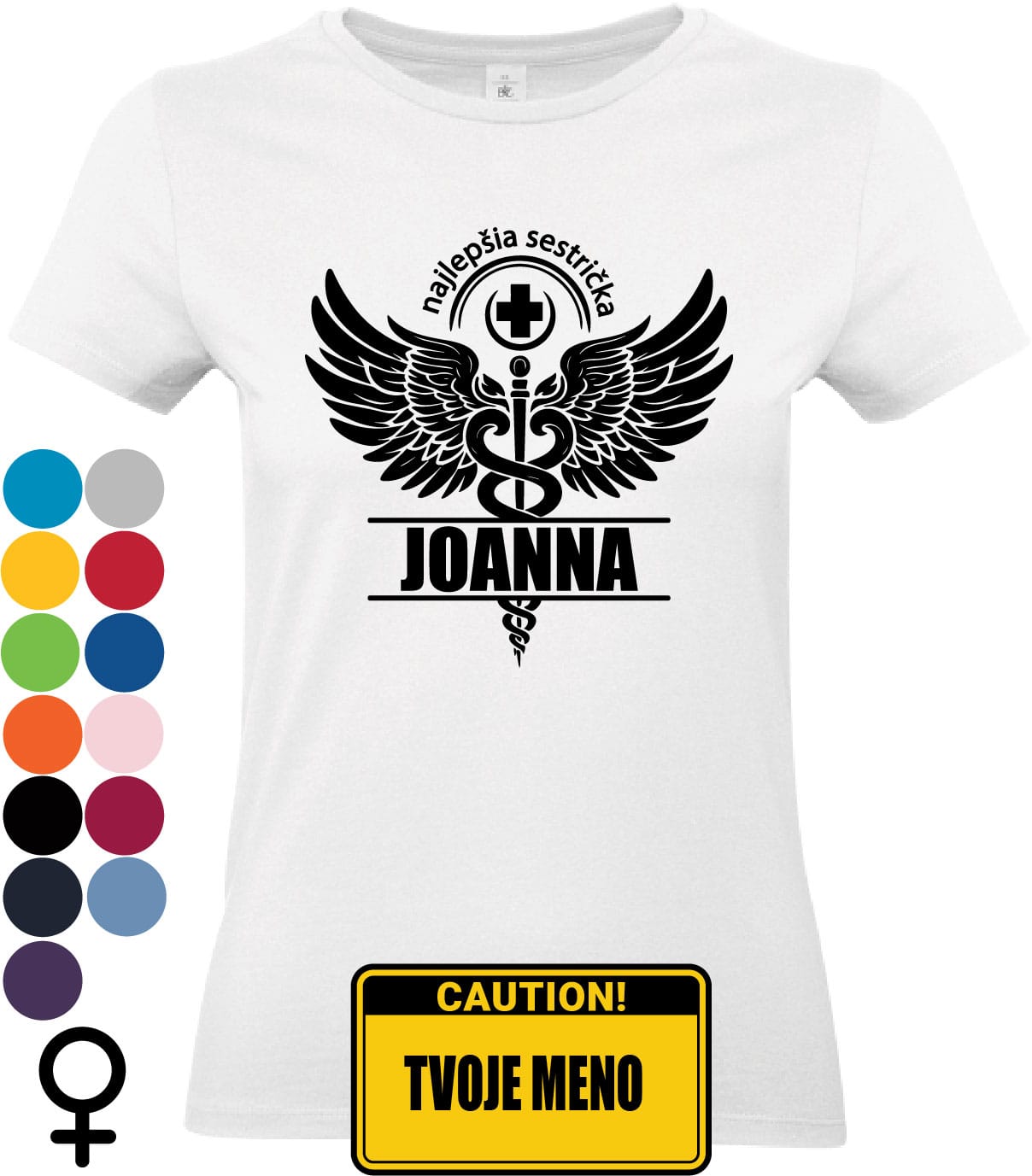 Na dizajne nájdeš symbol medicíny s krídlami, ktorý predstavuje silu, empatiu a odvahu. A keď do neho pridáš meno, stáva sa osobným odkazom. Originálny dizajn na bielom tričku pôsobí čisto, no zároveň silno – presne ako tie najlepšie sestričky.